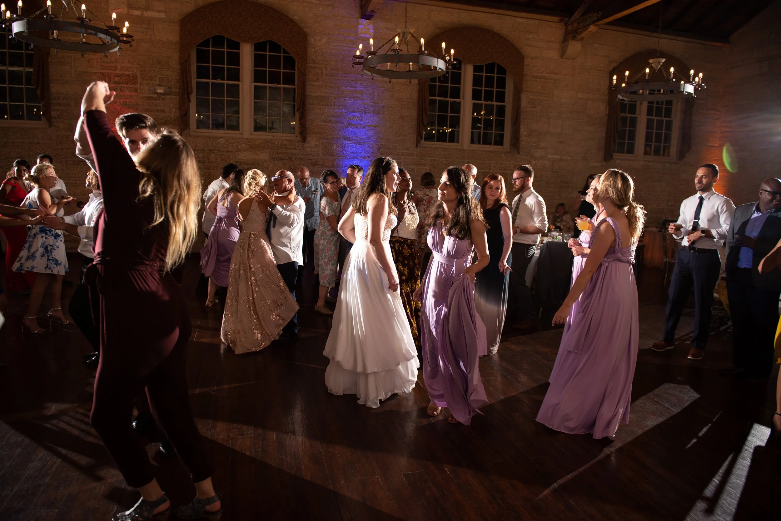 People dancing at a wedding reception in a rustic hall with brick walls and high windows, decorated with chandeliers and purple lighting.