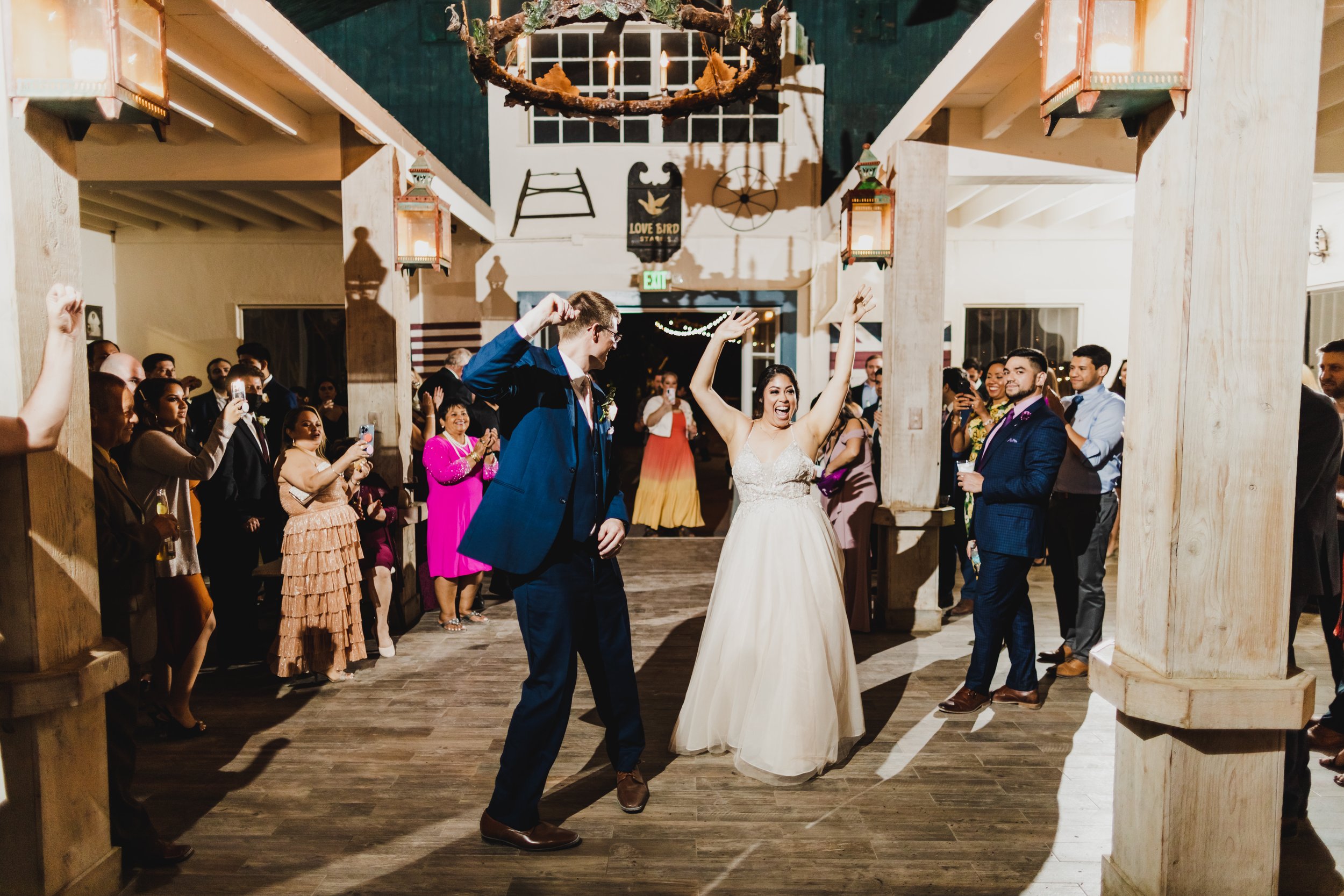 Bride and groom dancing and celebrating at their wedding reception, surrounded by guests in a decorated venue.