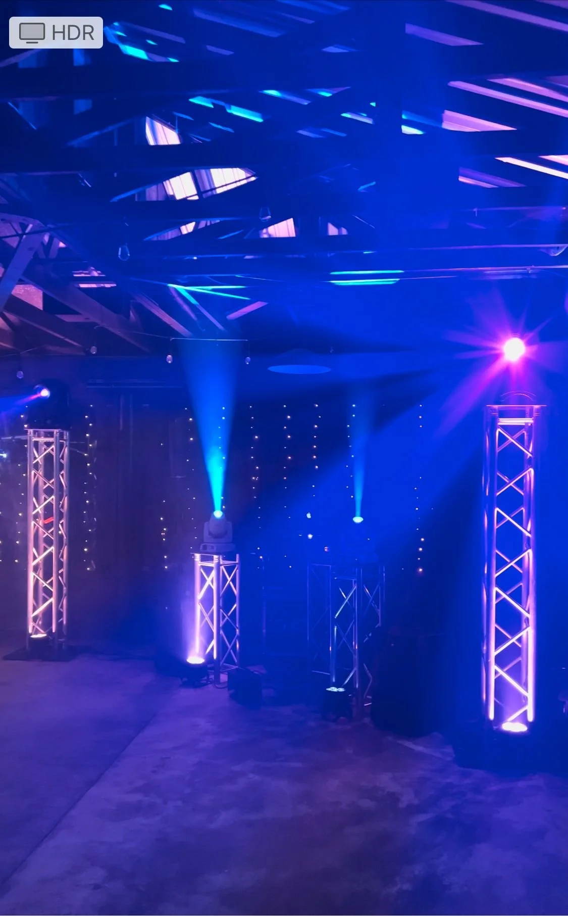 A stage setup with colorful blue and purple lighting, LED spotlights on tall truss stands, and a backdrop of small lights, likely for a concert or event.