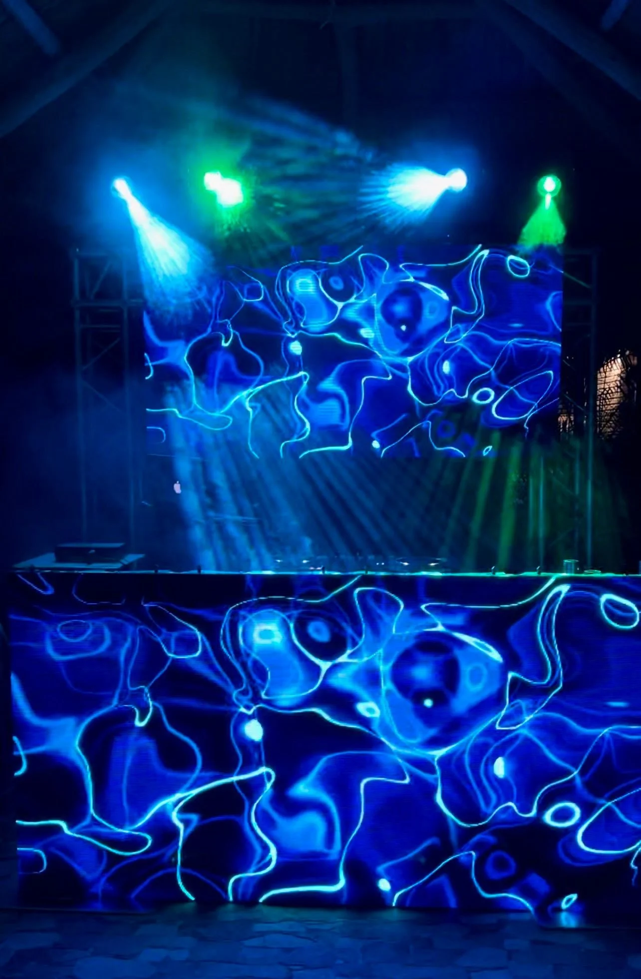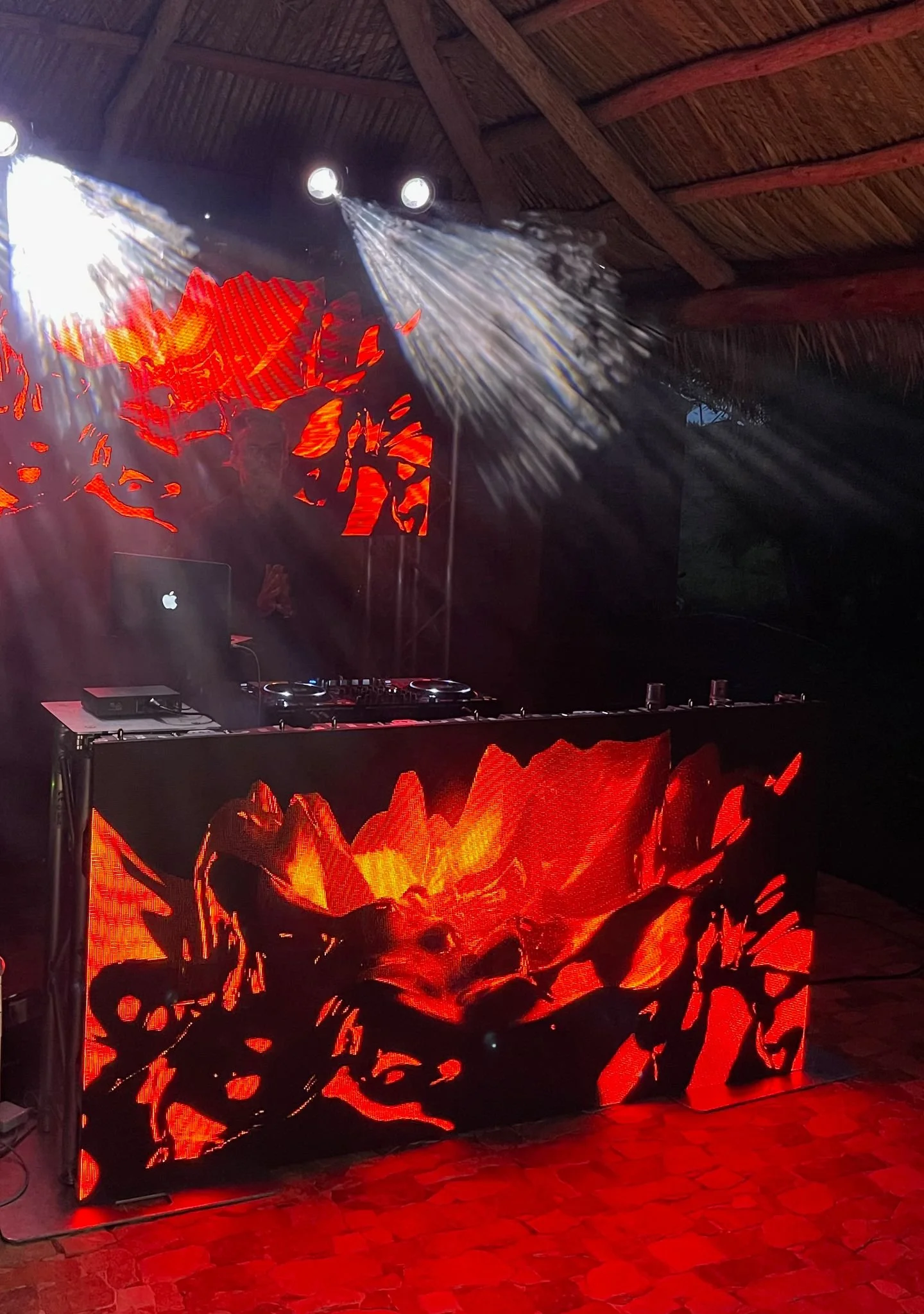 A DJ setup with a digital screen featuring a red and black abstract design, illuminated by stage lights under a thatched roof at night.