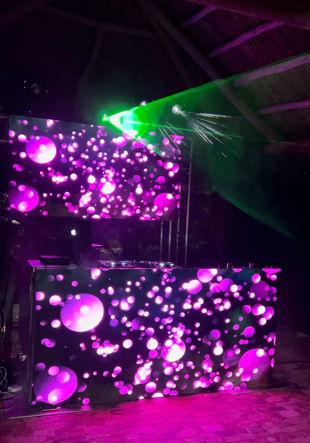 A DJ setup with large LED screens displaying purple and pink bubbles, accompanied by laser lights projecting green and silver beams in a dark venue.