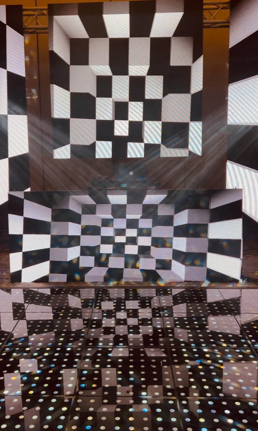 A black and white checkered optical illusion art installation with cubes and checkered patterns projecting shadows, creating a visual tunnel effect.