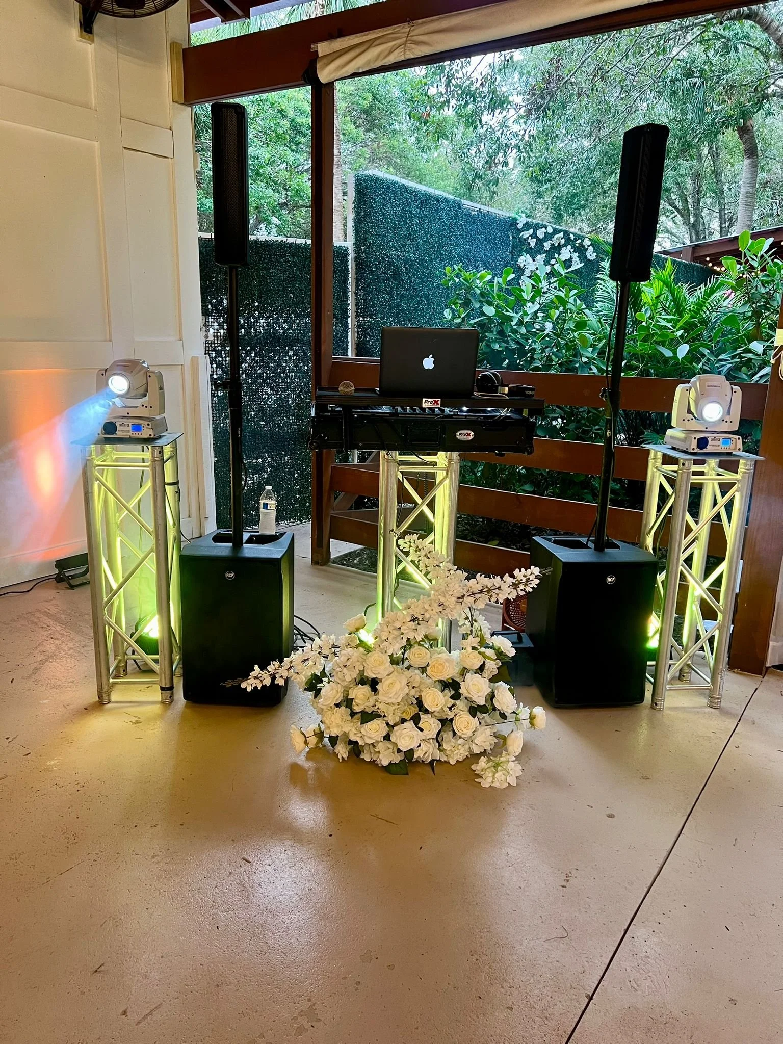 A DJ setup with speakers, lights, a laptop, and floral arrangement on the floor, set up indoors near a window with greenery outside.